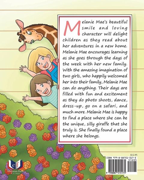 Melanie Mae's beautiful smile and loving character will delight children as they read about her adventures in a new home. Melanie Mae encourages learning as she goes through the days of the week with her new family. With the amazing imagination of two girls, who happily welcomed her into their family, Melanie Mae can do anything. Their days are filled with fun and excitement as they do photo shoots, dance, dress-up, go on a safari, and much more. Melanie Mae is happy to find a place where she can be the unique, silly giraffe that she truly is. She finally found a place where she belongs. Tiffany, the author, hopes you fall in love with the giraffe's fun-loving character in the same way her family has enjoyed going on these adventures in their home with Melanie Mae, a large stuffed giraffe. The rhyming and repetitive nature of this book will promote learning and language concepts while encouraging imaginative play in the younger child. This warmhearted and fun book will provide entertainment and enhance imaginations for years to come.