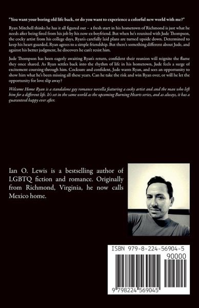 "You want your boring old life back, or do you want to experience a colorful new world with me?" Ryan Mitchell thinks he has it all figured out - a fresh start in his hometown of Richmond is just what he needs after being fired from his job by his now ex-boyfriend. But when he's reunited with Jude Thompson, the cocky artist from his college days, Ryan's carefully laid plans are turned upside down. Determined to keep his heart guarded, Ryan agrees to a simple friendship. But there's something different about Jude, and against his better judgment, he discovers he can't resist him. Jude Thompson has been eagerly awaiting Ryan's return, confident their reunion will reignite the flame they once shared. As Ryan settles back into the rhythm of life in his hometown, Jude feels a surge of excitement coursing through him. Cocksure and confident, Jude wants Ryan, and sees an opportunity to show him what he's been missing all these years. Can he take the risk and win Ryan over, or will he let the opportunity for love slip away? Welcome Home Ryan is a standalone gay romance novella featuring a cocky artist and and the man who left him for a different life. It's set in the same world as the upcoming Burning Hearts series, and as always, it has a guaranteed happy ever after.