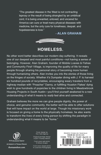 Homeless. No other word better describes our modern-day suffering. It reveals one of our deepest and most painful conditions--not having a sense of belonging. However, Alan Graham, founder of Mobile Loaves & Fishes and Community First! Village, is improving the quality of life for a large quantity of people through sharing his personal story of becoming more human through humanizing others. Graham believes the more we can give people dignity, the power of choice, and genuine community, the better we'll be able to offer solutions that will have impact on the world at large. And while his missionary work is focused on giving a home to the physically homeless, he also wants to transform the lives of every living person by shifting the paradigm in understanding what it means to be "home." In Welcome Homeless, Graham delves deep into what it means to be connected to God, the earth, and each other. In doing so, he shows us the home we've all longed for but never had. Welcome Homeless is about becoming fully human by being fully present. It is about finally connecting with the disconnected and finding our identity through knowing the true identity of others. Graham wants to engrain the human story in you so deeply that you start being who you were made to be--that you start finally being like the image from which you were made and start empathizing instead of sympathizing with the people around you. Similar to how we can become 100 percent fully human by mimicking the ultimate image, we can shape a better world by mimicking the picture of the new heaven and the new earth--a picture that has reality at the heart of it but is beyond our imagination. Alan Graham also shares his personal story, the stories of the homeless, and the stories of those whose worldviews have been shifted by the homeless. Because of his raw, humorous, and honest voice, he achieves a rare and profound universality. Houses become homes once they embody the stories of the people who have made these spaces into places of significance, meaning, and memory. Home is fundamentally a place of connection and of relationships that are life-giving and foundational. Graham invites you to make everyone feel truly at home by finally inviting those living on the fringes of society into your heart. This is why Welcome Homeless is about doing, not saying. It is about taking the ultimate and forward-thinking vision of a new heaven and new earth and literally breaking the soil so that new earth can exist here today. It is about realizing that homelessness is not fundamentally a consequence of moral and spiritual inadequacies; but rather it is often the logical and economical outcome for a large part of our population. So, what does your vision of humanity and love look like? Whatever the vision, it should look like community. People should feel more alive after they meet you. When your consciousness changes from one of self-absorption to a consciousness aware of its human desire for connection, compassion, kindness, and beauty, you will start seeing things differently--and others will start seeing you made anew as well because the absolute greatest self-help occurs when you help others