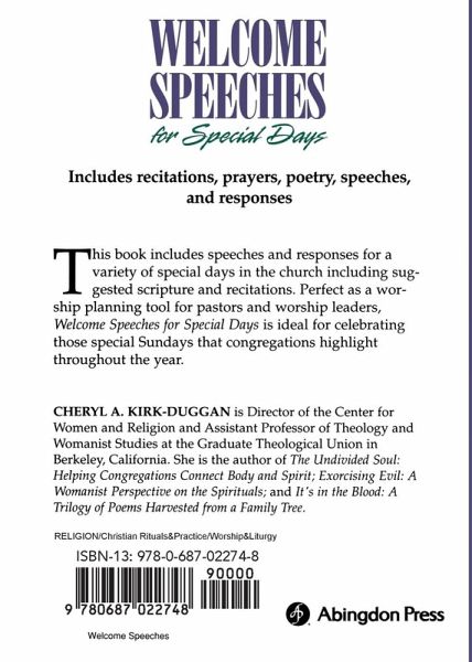 Includes recitations, prayers, poetry, speeches, and responses for special days in the African American church. This book includes speeches and responses for a variety of special days in the church including suggested Scripture and recitations. Perfect as a worship planning tool for pastors and other worship leaders, Welcome Speeches for Special Days is ideal for celebrating special Sundays that congregations highlight throughout the year.