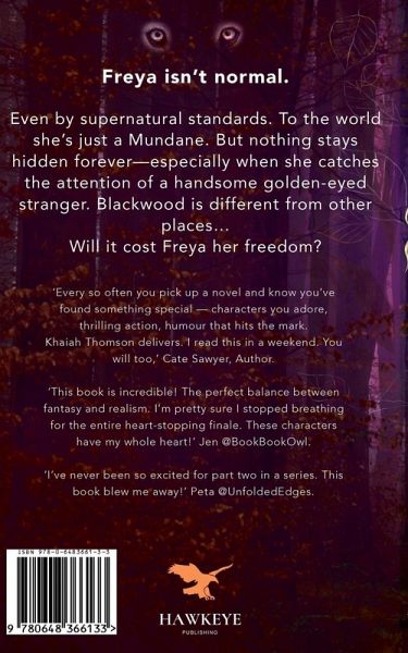Freya has spent her life on the run-trying to blend in amongst Mundanes. Like her father, she is a Syphon with the ability to draw energy from others, including their powers. When Freya accidentally draws energy from a friend, she and her family are on the run again and return to her mum's hometown of Blackwood, where Freya's abilities remain a secret. Freya's mum and brother are wolf shifters-genetics that skipped Freya. Freya has to decide by eighteen whether she joins their pack or remains independent. Freya discovers Blackwood is a secretive community comprised mostly of Supernaturals like herself. Supers exist outside of mundane laws. With many communities like Blackwood competing for power, strict rules protect the Blackwood community. Freya meets Beau, rumoured to be a lone wolf, although loosely attached to the Northern Blackwood wolves, her family's rival pack. He is hostile towards Freya due to the power he senses in her, but when he rescues her from a risky situation, they become more than friends, creating tension with her family and rival packs. What happens next in the town where nothing is normal could cost Freya her freedom...