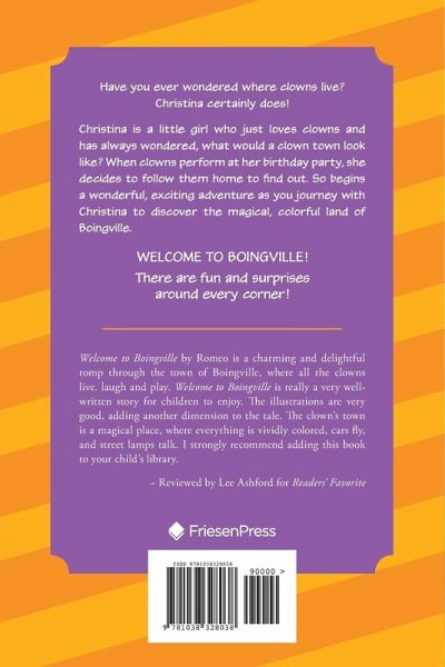Have you ever wondered where clowns live? Christina certainly does! Christina is a little girl who just loves clowns and has always wondered, what would a clown town look like? When clowns perform at her birthday party, she decides to follow them home to find out. So begins a wonderful, exciting adventure as you journey with Christina to discover the magical, colorful land of Boingville. WELCOME TO BOINGVILLE! There are fun and surprises around every corner!