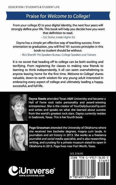 Praise for Welcome to College! From your college ID to your digital identity, the next four years will strongly define your life. This book will help you decide how you want that definition to read. -Eric Stoller, Inside Higher Ed Dayna has a simple yet effective way of teaching success. From orientation to graduation, you will find 101 success principles in this book no student should be without. -Rick Sherréll, Pro Speakers Bureau: College Speakers and Trainers It is no secret that heading off to college can be both exciting and terrifying. From registering for classes to making new friends to learning to think independently, it all can seem overwhelming to anyone leaving home for the first time. Welcome to College! shares valuable, down-to-earth wisdom for any young adult interested in embracing every aspect of college and ultimately leading a happy, successful, and full life.