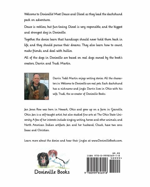 Welcome to Doxieville! Meet Deuce and Diesel as they lead the dachshund pack on adventures. Deuce is reckless, but fun-loving. Diesel is very responsible, and the biggest and strongest dog in Doxieville. Together, the doxies learn that handicaps should never hold them back in life, and they should pursue their dreams. They also learn how to count, make friends, and deal with bullies. All of the dogs in Doxieville are based on real dogs owned by the book's creators, Darrin and Trudi Martin.