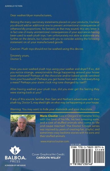 Dear washer/dryer manufacturers, Among the many cautionary statements placed on your products, I believe you should add an additional one to prevent unintentional consequences of otherworldly proportions. As fantastic as that may sound, this very letter is in fact one of many unintentional consequences of your appliances having been used to wash plush toys. I am unfortunately not able to elaborate any further on the details, but I plead with you to consider adding the following statement on all your manufactured goods: Caution: Plush toys should not be washed using this device. Sincerely yours, Doctor S. Have you ever washed plush toys using your washer and dryer? If so, did you notice strange, unexplainable things happening around your house soon afterward? Perhaps all the chocolate and/or baked goods vanished from your household? Perhaps you got home from work to find everything a mess? Perhaps your alarm clock ring tone changed by itself? After having washed your plush toys, did you ever get the feeling they were staring back at you? If any of this sounds familiar, then Sam and Nathan's adventures with their plush toy, Doctor S, may shed light on what may be happening at your house. Warning: You may want to hide your diamonds and your chocolate.