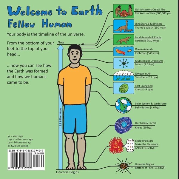 Welcome to Earth fellow human and join us on a fun journey through the most important parts of our history. Using your body as a timeline of the universe, we travel from the bottom of your feet to the top of your head to see how the Earth was formed and how we humans came to be. See how we went from elements, to stars, to Earth and to human technology. A great book for curious humans, ages 8 to 100. Visit www.welcometoearth.net
