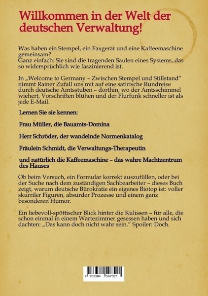 Welcome to Germany - Zwischen Stempel und StillstandEin satirischer Blick in die Welt der deutschen Ämter.Wartemarken ziehen, Formulare in dreifacher Ausfertigung, und irgendwo ist immer jemand "nicht zuständig" - willkommen im Bürokratiedschungel der Bundesrepublik. Rainer Zufall nimmt seine Leser mit auf eine urkomische Reise durch deutsche Behörden und lässt sie Bekanntschaft machen mit Stempelfetischisten, Vorschriften-Jongleuren und der mächtigsten Figur im Amt: der Kaffeemaschine.Mit scharfem Witz und viel Sympathie erzählt dieses Buch von absurden Dienstwegen, legendären Kaffeepausen und einem System, das so unlogisch wie erstaunlich funktional ist. Wer jemals in einem Wartezimmer gesessen oder ein Formular falsch ausgefüllt hat, wird sich auf jeder Seite wiederfinden.
