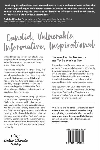 NEW EDITION - Now includes a bonus chapter from Laurie's newest memoir, Selling Vegetables to Drunks. Heralded by autism advocate Temple Grandin as "an honest memoir about perseverance and hope." Candid, Vulnerable, Informative, Inspirational When Skyler was three years old, he was diagnosed with severe, non-verbal Autism. When he was 17, his mom wrote a book about his amazing life. From page one, Welcome to My Life delivers on its promise to place you squarely in Skyler's life, surrounded by mom and dad, Laurie and Josh, and superstar sister, Kendall. Detailed sensory descriptions take you to doctors' appointments and trick-or-treating, to Qdoba and the kitchen table, to the bathroom for another "pull-ups" change, to family gatherings, to the Autism Center, and to conversations and internal dialogue so honest that you'll feel like you're part of the family too. Welcome to My Life shares the 14-year journey of a true warrior mom advocating for her non-verbal, severely Autistic son from diagnosis through his teenage years. This brutally honest and heartwarming account details the daily struggles and often lack of social understanding that families face when raising a child who relies on parental assistance for every need. "A memoir like no other -- honest and raw, hilarious and unexpected, heartbreaking and uplifting. Laurie L. Hellmann's Welcome to My Life is a love letter to her son Skyler and a welcome letter to the masses. It is dose of reassurance to us all, and a reminder that the world -- even when it's unpredictable and frightening -- is still shimmering with silver linings and powerful lessons." Because He Has No Words and Yet So Much to Say For mothers and fathers, sister and brothers, Autism isn't a personal diagnosis ... it's a family diagnosis. Especially when your Autistic loved one copes with significant development delays, suffers from serious chronic medical conditions, is an insomniac, and exhibits behaviors that disrupt the flow of day-to-day life. Autism turns households inside out, cracks hearts wide open and turns daily routines upside down. Experience the laughter and love, unspoken bonds and unflagging devotion of one very special family. And be changed forever by the knowledge that a mother's love knows no bounds, and that Autism -- though it presents various challenges -- does not define who a person is nor does it devalue or diminish their contributions to this world.