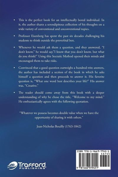 ¿ This is the perfect book for an intellectually bored individual. In it, the author shares a serendipitous collection of his thoughts on a wide variety of conventional and unconventional topics. ¿ Professor Eisenberg has spent the past six decades challenging his students to think outside the proverbial box. ¿ Whenever he would ask them a question, and they answered, "I don't know," he would say,"I know that you don't know, but what do you think?" Using this Socratic Method opened their minds and encouraged them to take risks. ¿ Convinced that a good question outweighs a hundred trite answers, the author has included a section of the book in which he asks himself a question and then proceeds to answer it. His favorite question is, "What one word best describes your life?" His answer was, "Creative." ¿ The reader should come away from this book with a deeper understanding of why he chose the title, "Welcome to my mind." He enthusiastically agrees with the following quotation. "Whatever we possess becomes double value when we have the opportunity of sharing it with others." Jean-Nicholas Bouilly (1763-1842)