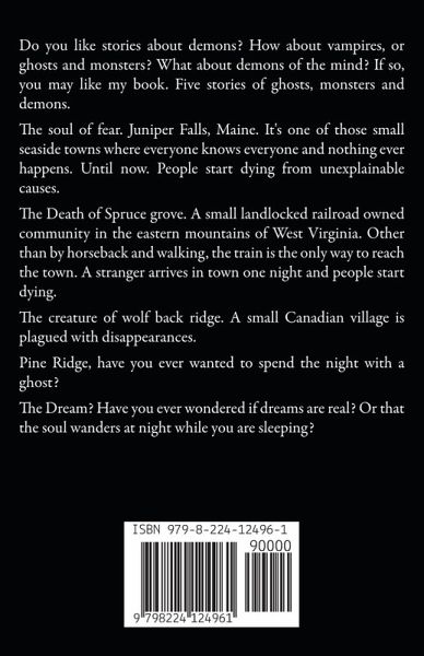 Do you like stories about demons? How about vampires, or ghosts and monsters? What about demons of the mind? If so, you may like my book. Five stories of ghosts, monsters and demons. The soul of fear. Juniper Falls, Maine. It's one of those small seaside towns where everyone knows everyone and nothing ever happens. Until now. People start dying from unexplainable causes. The Death of Spruce grove. A small landlocked railroad owned community in the eastern mountains of West Virginia. Other than by horseback and walking, the train is the only way to reach the town. A stranger arrives in town one night and people start dying. The creature of wolf back ridge. A small Canadian village is plagued with disappearances. Pine Ridge, have you ever wanted to spend the night with a ghost? The Dream? Have you ever wondered if dreams are real? Or that the soul wanders at night while you are sleeping?