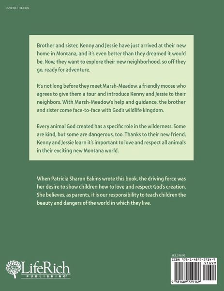 Brother and sister, Kenny and Jessie have just arrived at their new home in Montana, and it's even better than they dreamed it would be. Now, they want to explore their new neighborhood, so off they go, ready for adventure. It's not long before they meet Marsh-Meadow, a friendly moose who agrees to give them a tour and introduce Kenny and Jessie to their neighbors. With Marsh-Meadow's help and guidance, the brother and sister come face-to-face with God's wildlife kingdom. Every animal God created has a specific role in the wilderness. Some are kind, but some are dangerous, too. Thanks to their new friend, Kenny and Jessie learn it's important to love and respect all animals in their exciting new Montana world.