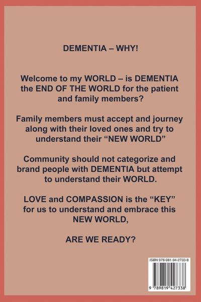 DEMENTIA - WHY!Welcome to my WORLD - is DEMENTIA the END OF THE WORLD for the patient and family members?Family members must accept and journey along with their loved ones and try to understand their "NEW WORLD"Community should not categorize and brand people with DEMENTIA but attempt to understand their WORLD.LOVE and COMPASSION is the "KEY" for us to understand and embrace this NEW WORLD,ARE WE READY?