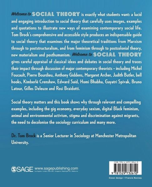 Welcome to Social Theory is exactly what students want: a lucid and engaging introduction to social theory that carefully uses images, examples and quotations to illustrate new ways of examining contemporary social life. Tom Brock s comprehensive and accessible style produces an indispensable guide to social theory that examines the major theoretical traditions from Marxism through to poststructuralism, and from feminism through to postcolonial theory, new materialism and posthumanism. Welcome to Social Theory gives careful appraisal of classical ideas and debates in social theory and traces their impact through discussion of major contemporary theorists including Michel Foucault, Pierre Bourdieu, Anthony Giddens, Margaret Archer, Judith Butler, bell hooks, Kimberlé Crenshaw, Edward Said, Homi Bhabha, Gayatri Spivak, Bruno Latour, Gilles Deleuze and Rosi Braidotti.