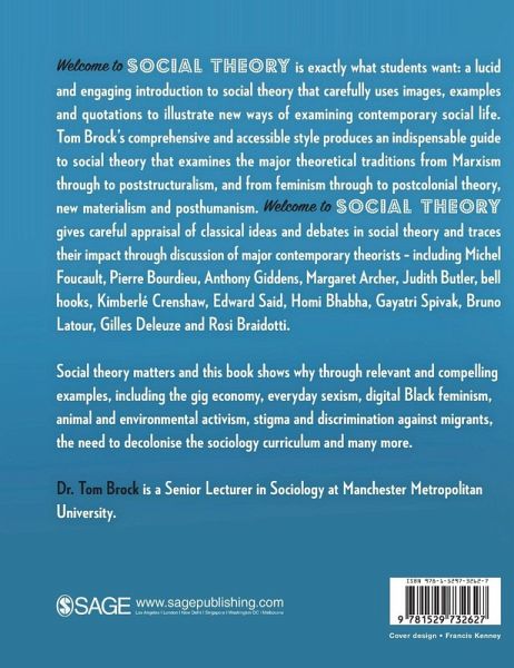 Welcome to Social Theory is exactly what students want: a lucid and engaging introduction to social theory that carefully uses images, examples and quotations to illustrate new ways of examining contemporary social life. Tom Brock s comprehensive and accessible style produces an indispensable guide to social theory that examines the major theoretical traditions from Marxism through to poststructuralism, and from feminism through to postcolonial theory, new materialism and posthumanism. Welcome to Social Theory gives careful appraisal of classical ideas and debates in social theory and traces their impact through discussion of major contemporary theorists including Michel Foucault, Pierre Bourdieu, Anthony Giddens, Margaret Archer, Judith Butler, bell hooks, Kimberlé Crenshaw, Edward Said, Homi Bhabha, Gayatri Spivak, Bruno Latour, Gilles Deleuze and Rosi Braidotti.