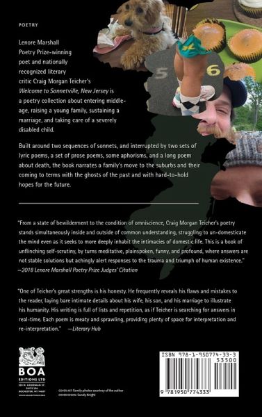 Craig Morgan Teicher is the author of four books of poems: Welcome to Sonnetville, New Jersey (BOA, 2021); The Trembling Answers (BOA, 2017), which won the 2015 Lenore Marshall Poetry Prize from the Academy of American Poets; To Keep Love Blurry (BOA, 2012); and Brenda Is in the Room and Other Poems (CLP, 2007), winner of the 2007 Colorado Prize for Poetry. He also wrote Cradle Book: Stories and Fables (BOA, 2010) and the chapbook Ambivalence and Other Conundrums (Omnidawn, 2014). His first collection of essays, We Begin in Gladness, was published by Graywolf in November, 2018. Teicher edited Once and For All: The Best of Delmore Schwartz (New Directions, 2016) and serves as a poetry editor for The Literary Review. He writes about books for many publications, including The New York Times Book Review, The LA Times, and NPR. He worked for many years at Publishers Weekly and is now Digital Director of The Paris Review. He is a 2021 recipient of a fellowship from the Guggenheim Foundation. He lives in New Jersey with his wife and children.