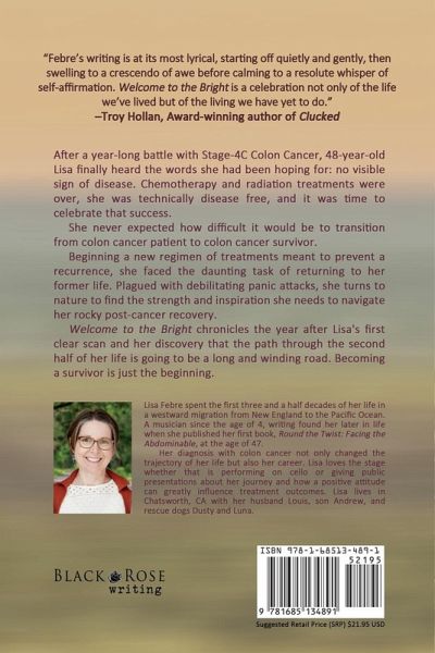 "Febre's writing is at its most lyrical, starting off quietly and gently, then swelling to a crescendo of awe before calming to a resolute whisper of self-affirmation. Welcome to the Bright is a celebration not only of the life we've lived but of the living we have yet to do." -Troy Hollan, award-winning author of Clucked After a year-long battle with Stage-4C Colon Cancer, 48-year-old Lisa finally heard the words she had been hoping for: no visible sign of disease. Chemotherapy and radiation treatments were over, she was technically disease free, and it was time to celebrate that success. She never expected how difficult it would be to transition from colon cancer patient to colon cancer survivor. Beginning a new regimen of treatments meant to prevent a recurrence, she faced the daunting task of returning to her former life. Plagued with debilitating panic attacks, she turns to nature to find the strength and inspiration she needs to navigate her rocky post-cancer recovery. Welcome to the Bright chronicles the year after Lisa's first clear scan and her discovery that the path through the second half of her life is going to be a long and winding road. Becoming a survivor is just the beginning.