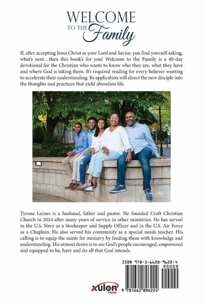If, after accepting Jesus Christ as your Lord and Savior, you find yourself asking, what's next...then this book's for you! Welcome to the Family is a 40-day devotional for the Christian who wants to know who they are, what they have and where God is taking them. It's required reading for every believer wanting to accelerate their understanding. Its application will direct the new disciple into the thoughts and practices that yield abundant life. Tyrone Luines is a husband, father and pastor. He founded Croft Christian Church in 2014 after many years of service in other ministries. He has served in the U.S. Navy as a Storkeeper and Supply Officer and in the U.S. Air Force as a Chaplain. He also served his community as a special needs teacher. His calling is to equip the saints for ministry by feeding them with knowledge and understanding. His utmost desire is to see God's people encouraged, empowered and equipped to be, have and do all that God intends.