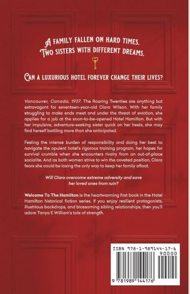 A family fallen on hard times. Two sisters with different dreams. Can a luxurious hotel forever change their lives? Vancouver, Canada, 1927. The Roaring Twenties are anything but extravagant for seventeen-year-old Clara Wilson. With her family struggling to make ends meet and under the threat of eviction, she applies for a job at the soon-to-be-opened Hotel Hamilton. But with her impulsive, adventure-seeking sister quick on her heels, she may find herself battling more than she anticipated. Feeling the intense burden of responsibility and doing her best to navigate the opulent hotel's rigorous training program, her hopes for survival crumble when she encounters rivalry from an out-of-place socialite. And as both women strive to win the coveted position, Clara fears she could be losing the only way to keep her family afloat. Will Clara overcome extreme adversity and save her loved ones from ruin? Welcome To The Hamilton is the heartwarming first book in the Hotel Hamilton historical fiction series. If you enjoy resilient protagonists, illustrious backdrops, and blossoming sibling relationships, then you'll adore Tanya E William's tale of strength.