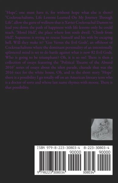 "Hope", one must have it, for without hope what else is there? "Cockroachalisms, Life Lessons Learned On My Journey Through Life", allow the guru of wellness that is Xavier Cockroachal Damon to lead you down the path of happiness with life lessons only he could teach. "Motel Hell", the place where lost souls dwell. "Climb from Hell", Supustrus is trying to rescue himself and his wife by escaping hell. Will they make it? "Gus Versus the Evil Gods", an offshoot of Cockroachalisms where the dominant personality of an intentionally splintered mind is set to do battle against what is now 82 Evil Gods. Who is going to be triumphant? Oh, it is so on! There is then a collection of essays featuring the "Political Theatre of the Absurd 2016" series of essays about the idiot parade, charade that was the 2016 race for the white house. Oh, and in the short story "Hope" there is a possibility I go totally off on an American literary icon who is a doctor of sorts and whose last name rhymes with moose. There is that possibility.