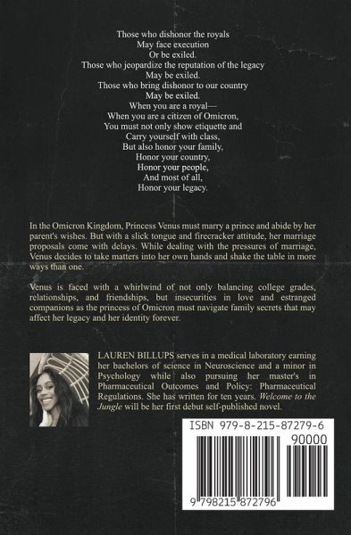 Mature Audiences 18+ _______________________________ Those who dishonor the royals May face execution Or be exiled. Those who jeopardize the reputation of the legacy May be exiled. Those who bring dishonor to our country May be exiled. When you are a royal- When you are a citizen of Omicron, You must not only show etiquette and Carry yourself with class, But also honor your family, Honor your country, Honor your people, And most of all, Honor your legacy. In the Omicron Kingdom, Princess Venus must marry a prince and abide by her parent's wishes. But with a slick tongue and firecracker attitude, her marriage proposals come with delays. While dealing with the pressures of marriage, Venus decides to take matters into her own hands and shake the table in more ways than one. Venus is faced with a whirlwind of not only balancing college grades, relationships, and friendships, but insecurities in love and estranged companions as the princess of Omicron must navigate family secrets that may affect her legacy and her identity forever.