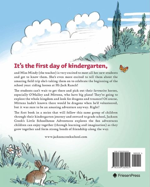 It's the first day of kindergarten, and Miss Mindy (the teacher) is very excited to meet all her new students and get to know them. She's even more excited to tell them about the amazing field trip she's taking them on to celebrate the beginning of the school year: riding horses at Hi-Jack Ranch! The students can't wait to get there and pick out their favourite horses, especially O'Malley and Mittens, who have big plans! They're going to explore the whole kingdom and look for dragons and treasure! Of course, Mittens hadn't known there would be dragons when he'd volunteered, but it was sure to be an amazing adventure anyway. Right? The first book in a series that will follow this same group of children through their kindergarten journey and onward to grade school, Jackson Creek's Little Schoolhouse Adventures explores the fun adventures children can enjoy together (through learning and imagination) as they grow together and form strong bonds of friendship along the way.