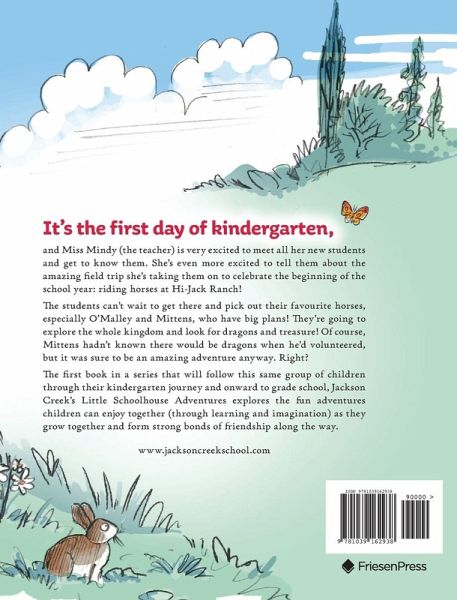 It's the first day of kindergarten, and Miss Mindy (the teacher) is very excited to meet all her new students and get to know them. She's even more excited to tell them about the amazing field trip she's taking them on to celebrate the beginning of the school year: riding horses at Hi-Jack Ranch! The students can't wait to get there and pick out their favourite horses, especially O'Malley and Mittens, who have big plans! They're going to explore the whole kingdom and look for dragons and treasure! Of course, Mittens hadn't known there would be dragons when he'd volunteered, but it was sure to be an amazing adventure anyway. Right? The first book in a series that will follow this same group of children through their kindergarten journey and onward to grade school, Jackson Creek's Little Schoolhouse Adventures explores the fun adventures children can enjoy together (through learning and imagination) as they grow together and form strong bonds of friendship along the way.