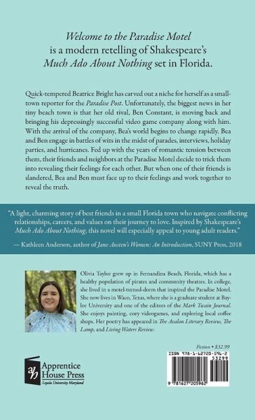 Welcome to the Paradise Motel is a modern retelling of Shakespeare's Much Ado About Nothing set in Florida. Quick-tempered Beatrice Bright has carved out a niche for herself as a small-town reporter for the Paradise Post. Unfortunately, the biggest news in her tiny beach town is that her old rival, Ben Constant, is moving back and bringing his depressingly successful video game company along with him. With the arrival of the company, Bea's world begins to change rapidly. Bea and Ben engage in battles of wits in the midst of parades, interviews, holiday parties, and hurricanes. Fed up with the…mehr