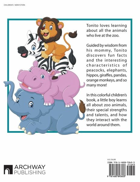 Tonito loves learning about all the animals who live at the zoo. Guided by wisdom from his mommy, Tonito discovers fun facts and the interesting characteristics of peacocks, elephants, hippos, giraffes, pandas, orange monkeys, and so many more! In this colorful children's book, a little boy learns all about zoo animals, their special strengths and talents, and how they interact with the world around them.Tonito loves learning about all the animals who live at the zoo. Guided by wisdom from his mommy, Tonito discovers fun facts and the interesting characteristics of peacocks, elephants, hippos, giraffes, pandas, orange monkeys, and so many more! In this colorful children's book, a little boy learns all about zoo animals, their special strengths and talents, and how they interact with the world around them.