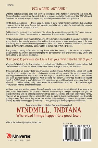 "Pick a card. Any card." With this trademark phrase, along with a wink, a winning grin and a handful of entertaining card tricks, Mr. Mercury Ecks has come to town. Windmill, Indiana, to be exact. And while the citizens of this 1950's Midwest farm town are naturally wary of strangers, they soon fall prey to the drifter's principal charm. For Mr. Ecks knows things . . . Things about the people in town: Things that can help them: Help solve their problems. Relieve their fears. Remove their obstacles. And all he asks in return for sharing what he knows is a fee, a small fee. Or so at seems at first. But the small fee turns out to be much larger. Too late do the town's citizens learn Mr. Ecks' secret purpose: The destruction of lives. The destruction of communities. The destruction of Windmill itself. For Laura Connerson, newly returned to Windmill, Mr. Ecks' gift of mind-reading is especially tempting: Her young daughter has recently gone missing, and the stranger seems to know something about it. Or more specifically, seems to know something hidden in Laura's mind about it: Some bit of evidence, lost in the depths of her memory. A memory, a clue, waiting to be retrieved by him. For a price. The grinning, prancing drifter offers to help Laura probe her memory for the clue to her daughter's disappearance. But what he asks in exchange for his service is more than she is willing to pay. Unless she can beat him at his own evil mind games . . . "I am going to penetrate you, Laura. First your mind. Then the rest of you." Welcome to Windmill is the first book in a series about quaint but luckless Windmill, Indiana: A town that misfortune seems to favor, but whose citizens nevertheless manage to survive, and even thrive. Three years after Mr. Mercury Ecks' disastrous visit, another stranger, Nathan Devlin, arrives with an old chest full of curious objects for sale . . . Curious and, some would say, magical. But once purchased, these seemingly-innocent curios begin to work more than magic on the good citizens of the town . . . And trinkets that seem quaint at first turn dangerous. What is behind their power? And why has this stranger brought them? In Rabbit's Foot, a man's bitterness and confusion over an old heartbreak wreaks new havoc on Windmill . . . Until an ordinary rabbit's foot reveals the truth of Nathan's lost love Julia . . . And leads the two aged lovers to each other for a final reconciliation. Yet three years later, another stranger, Norma Swann by name, sets up shop in Windmill: A tea shop, to be exact, called Sweet Dreams. The citizens of Windmill, by now weary of strangers bearing strange gifts, try to avoid her shop with its tempting assortment of tea, cookies, candles, and bright knickknacks. Norma, however, will not be ignored: She has a special Gift, and she plans to share it. For Norma can send dreams to you in your sleep. Be nice to her, buy her tea, chat with her, and you will get good dreams, happy dreams, sweet dreams. But if you should happen to offend her . . . Well, prepare to be driven sleeplessly, horribly mad. Read all about Mercury, Nathan, Norma and the people of Windmill, Indiana Where bad things happen to a good town. Write to the author at jvshepherd1@aol.com Cover photograph by Judy Butz. Cover design by Bill Ferguson, Judy Butz and Anne Shepherd.