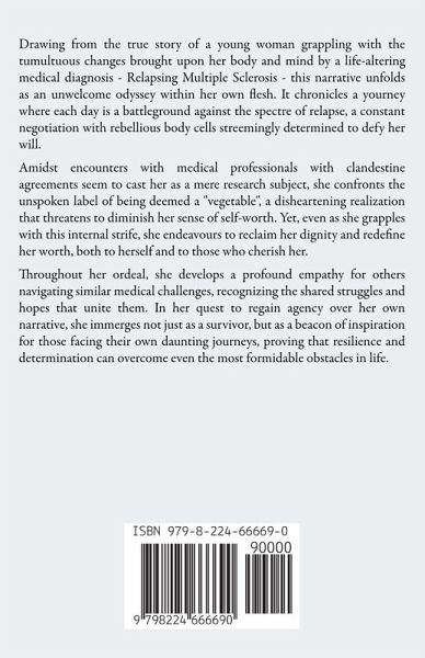 Drawing from the true story of a young woman grappling with the tumultuous changes brought upon her body and mind by a life-altering medical diagnosis - Relapsing Multiple Sclerosis - this narrative unfolds as an unwelcome odyssey within her own flesh. It chronicles a yourney where each day is a battleground against the spectre of relapse, a constant negotiation with rebellious body cells streemingly determined to defy her will. Amidst encounters with medical professionals with clandestine agreements seem to cast her as a mere research subject, she confronts the unspoken label of being deemed a "vegetable", a disheartening realization that threatens to diminish her sense of self-worth. Yet, even as she grapples with this internal strife, she endeavours to reclaim her dignity and redefine her worth, both to herself and to those who cherish her. Throughout her ordeal, she develops a profound empathy for others navigating similar medical challenges, recognizing the shared struggles and hopes that unite them. In her quest to regain agency over her own narrative, she immerges not just as a survivor, but as a beacon of inspiration for those facing their own daunting journeys, proving that resilience and determination can overcome even the most formidable obstacles in life.