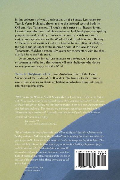 In this collection of weekly reflections on the Sunday Lectionary for Year B, Verna Holyhead draws us into the inspired texts of both the Old and New Testaments. Through a rich tapestry of literary forms, historical contributions, and life experiences, Holyhead gives us surprising perspectives and carefully constructed contexts, which are sure to enrich our appreciation for the Word of God. In addition to following St. Benedict's admonition to glean a harvest by attending mindfully to the pages and passages of the inspired books of the Old and New Testaments, Holyhead generously layers her commentary with insights distilled from the Rule itself. As a sourcebook for pastoral ministry or a reference for personal or communal reflection, this volume will assist believers who desire to engage more deeply with the Word. Verna Holyhead, SGS, is an Australian Sister of the Good Samaritan of the Order of St. Benedict. She leads retreats, lectures, and writes, all with an emphasis on biblical scholarship, liturgical insight, and pastoral challenge.
