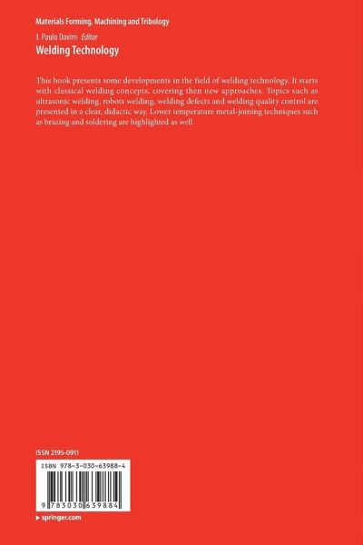 This book presents some developments in the field of welding technology. It starts with classical welding concepts, covering then new approaches. Topics such as ultrasonic welding, robots welding, welding defects and welding quality control are presented in a clear, didactic way. Lower temperature metal-joining techniques such as brazing and soldering are highlighted as well.