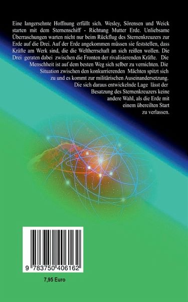 Eine langersehnte Hoffnung erfüllt sich. Wesley, Sörensen und Weick starten mit dem Sternenschiff - Richtung Mutter Erde.Unliebsame Überraschungen warten nicht nur beim Rückflug des Sternenkreuzers zur Erde auf die Drei. Auf der Erde angekommen müssen sie feststellen, dass Kräfte am Werk sind, die die Weltherrschaft an sich reißen wollen.Die Drei geraten dabei ziwischen die Fronten der rivalisierenden Kräfte.Die Menschheit ist auf dem besten Weg sich selber zu vernichten.Die Situation zwischen den konkurrierenden Mächten spitzt sich zu und es kommt zu militärischen Auseinandersetzungen. Die sich daraus entwicklende Lage lässt der Besatzung des Strenenkreuzers keine andere Wahl, als die Erde mit einem übereilten Start zu verlassen.