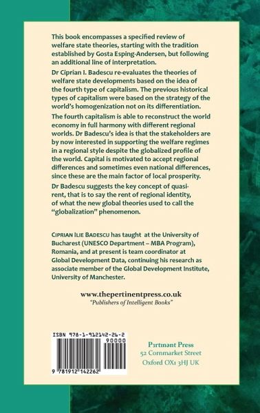 This book encompasses a specified review of welfare state theories, starting with the tradition established by Gosta Esping-Andersen, but following an additional line of interpretation. Dr Ciprian I. Badescu re-evaluates the theories of welfare state developments based on the idea of the fourth type of capitalism. The previous historical types of capitalism were based on the strategy of the world's homogenization not on its differentiation. The fourth capitalism is able to reconstruct the world economy in full harmony with different regional worlds. Dr Badescu's idea is that the stakeholders are by now interested in supporting the welfare regimes in a regional style despite the globalized profile of the world. Capital is motivated to accept regional differences and sometimes even national differences, since these are the main factor of local prosperity. Dr Badescu suggests the key concept of quasi-rent, that is to say the rent of regional identity, of what the new global theories used to call the "globalization" phenomenon.