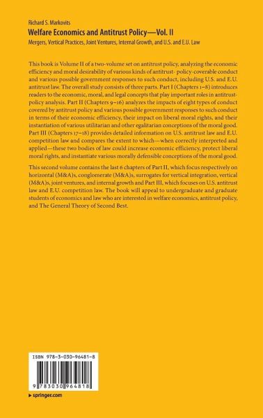 This second volume contains the last 6 chapters of Part II, which focus respectively on horizontal (M&A)s, conglomerate (M&A)s, surrogates for vertical integration, vertical (M&A)s, joint ventures, and internal growth and Part III, which focuses on US antitrust law and EU competition law. The book will appeal to undergraduate and graduate students of economics and law who are interested in welfare economics, antitrust policy, and The General Theory of Second Best.