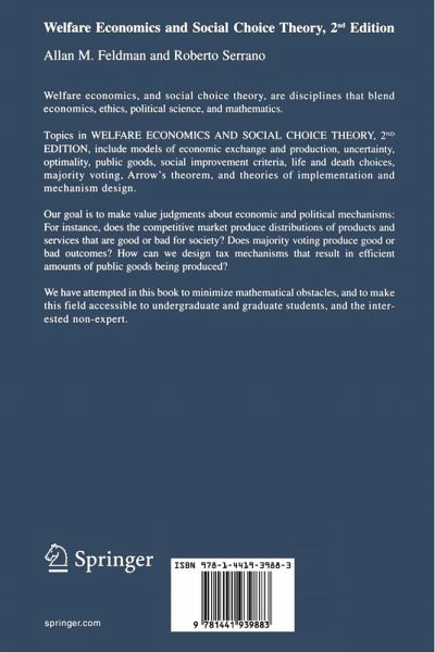 This book covers the main topics of welfare economics - general equilibrium models of exchange and production, Pareto optimality, un certainty, externalities and public goods - and some of the major topics of social choice theory - compensation criteria, fairness, voting. Arrow's Theorem, and the theory of implementation. The underlying question is this: "Is a particular economic or voting mechanism good or bad for society?" Welfare economics is mainly about whether the market mechanism is good or bad; social choice is largely about whether voting mechanisms, or other more abstract mechanisms, can improve upon the results of the market. This second edition updates the material of the first, written by Allan Feldman. It incorporates new sections to existing first-edition chapters, and it includes several new ones. Chapters 4, 6, 11, 15 and 16 are new, added in this edition. The first edition of the book grew out of an undergraduate welfare economics course at Brown University. Thebook is intended for the undergraduate student who has some prior familiarity with microeconomics. However, the book is also useful for graduate students and professionals, economists and non-economists, who want an overview of welfare and social choice results unburdened by detail and mathematical complexity. Welfare economics and social choice both probably suffer from ex cessively technical treatments in professional journals and monographs.