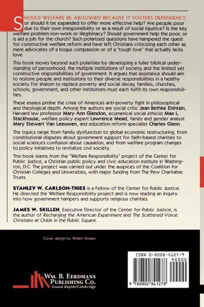 This is a print on demand book and is therefore non- returnable. Between 1992 and 1995, the Center for Public Justice, a Christian civic-education and public-policy think tank undertook an extended project named the Welfare Responsibility Inquiry. In May 1994, the project hosted a conference in Washington, DC, on "Public Justice and Welfare Reform." The project involved, at its center, a group of scholars who met periodically to discuss the issues involved. Those scholars then wrote the papers which are collected in Welfare in America. "Welfare in America," James Skillen writes, "argues that assistance to the needy does not, and should not, come primarily from government. Government, whether at federal or state levels, should help hold people accountable to their various institutional and personal responsibilities rather than fill in for every failure." The range of topics addressed in Welfare in America is extensive. Though no reader will agree with everything here, those whose calling requires them to think through this issue with care will be wise to include Welfare in America in their list of books to be read. Contributors: Stanley Carlson-Thies Jean Bethke Elshtain Max Stackhouse Bob Goudzwaard Mary Ann Glendon Stephanie Collins James Skillen John Mason Stephen Mott Lawrence Mead Mary Stewart Van Leeuwen Paul Marshall Anne Hallum Cynthia Neal Mary Van Hook John Hiemstra Charles Glenn Stephen Monsma Ronald Sider Julia Stronks Clarke Cochran