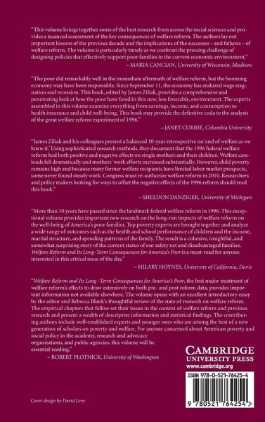 Two decades of federal and state-level demonstration projects and experiments concerning cash welfare in the United States culminated with the passage of the Personal Responsibility and Work Opportunity Reconciliation Act of 1996, better known as welfare reform. Ten years after reform there remain a host of unanswered questions on the well-being of low-income families. In Welfare Reform and its Long Term Consequences for America's Poor, many of the nation's leading poverty experts address these and related outcomes to assess the longer-term effects of welfare reform. A diverse array of survey and administrative data are brought to bear to examine the effects of welfare reform and the concomitant expansions of the Earned Income Tax Credit on the level and distribution of income, the composition of consumption, employment, public versus private health insurance coverage, health and education outcomes of children, marriage, and social service delivery.