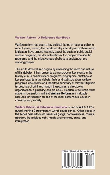 Welfare Reform presents the contemporary debate about welfare reform in the United States with an unbiased, objective point of view. Welfare Reform examines a wide range of programs and assistance policies of the U.S. federal and state governments. The opening essay sorts out which programs are generally regarded as "welfare," where they came from, and the current trends and issues driving the need for change. Special attention is given to the block grant programs of the 1980s and the new Child Protection Block Grant proposed as part of the Republicans' "Contract with America." Facts and statistics about welfare programs, recipients of benefits, and public opinion regarding welfare are presented in detail. This volume represents an important contribution to understanding one of the most debated social issues of our time.
