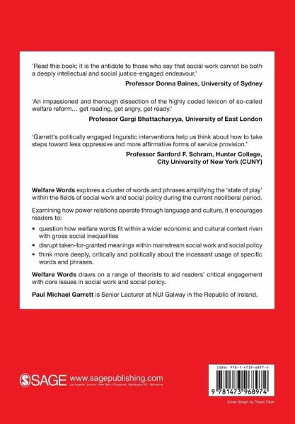 Welfare Words analyses the keywords and phrases commonly used by policy-makers, news-outlets and wider society, when referring to social policy, welfare reform and social work in the present-day culture of neoliberal capitalism. Examining how power relations operate through language and culture, it encourages readers to question how welfare words fit within a wider economic and cultural context riven with gross social inequalities; to disrupt taken-for-granted meanings within mainstream social work and social policy, and to think more deeply, critically and politically about the incessant usage of specific words and phrases. Written by an authoritative voice in the field, Paul Michael Garrett makes sense of complex theories which codify everyday experience, giving readers vital tools to better understand and change their social worlds.