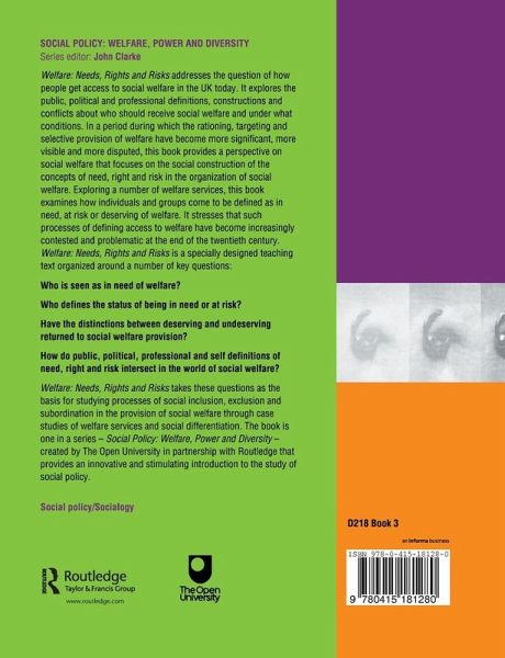 Welfare: Needs, Rights and Risks addresses the question of how people get access to social welfare in the UK today. It explores the public, political and professional definitions, constructions and conflicts about who should receive social welfare and under what conditions. In a period during which the rationing, targeting and selective provision of welfare have become more significant, more visible and more disputed, this book examines how individuals and groups come to be defined as in need, at risk or deserving of welfare.