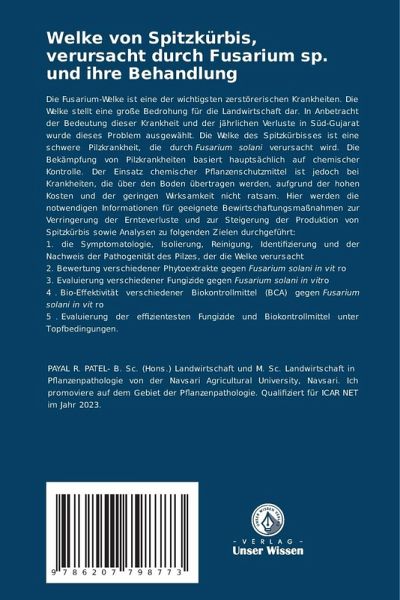 Die Fusarium-Welke ist eine der wichtigsten zerstörerischen Krankheiten. Die Welke stellt eine große Bedrohung für die Landwirtschaft dar. In Anbetracht der Bedeutung dieser Krankheit und der jährlichen Verluste in Süd-Gujarat wurde dieses Problem ausgewählt. Die Welke des Spitzkürbisses ist eine schwere Pilzkrankheit, die durch Fusarium solani verursacht wird. Die Bekämpfung von Pilzkrankheiten basiert hauptsächlich auf chemischer Kontrolle. Der Einsatz chemischer Pflanzenschutzmittel ist jedoch bei Krankheiten, die über den Boden übertragen werden, aufgrund der hohen Kosten und der geringen Wirksamkeit nicht ratsam. Hier werden die notwendigen Informationen für geeignete Bewirtschaftungsmaßnahmen zur Verringerung der Ernteverluste und zur Steigerung der Produktion von Spitzkürbis sowie Analysen zu folgenden Zielen durchgeführt:1. die Symptomatologie, Isolierung, Reinigung, Identifizierung und der Nachweis der Pathogenität des Pilzes, der die Welke verursacht 2. Bewertung verschiedener Phytoextrakte gegen Fusarium solani in vit ro 3. Evaluierung verschiedener Fungizide gegen Fusarium solani in vitro4. Bio-Effektivität verschiedener Biokontrollmittel (BCA) gegen Fusarium solani in vit ro 5. Evaluierung der effizientesten Fungizide und Biokontrollmittel unter Topfbedingungen.