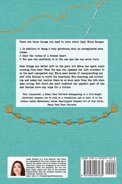 There are three things you need to know about Lady Eliza Morgan: 1. In addition to being a busy physician, she's an accomplished seamstress. 2. She's the victim of a broken heart. 3. The man who shattered it is the one man she can never have. Some things are better left in the past, but Eliza has spent years running from hers. When the man who upended her life re-enters it in the most unexpected way, Eliza must decide if reacquainting herself with Nicolas is worth the heartache. He's charming and irritating and makes her realize there is so much more than the life she's been living. But first she must confront her painful past if she and Nicolas have any hope for a future. 'Well Acquainted', a Penny Reid Universe Reimagining, is a full-length historical romance, can be read as a standalone, and is book #2 in the London Ladies Embroidery series, Smartypants Romance Out of this World, Penny Reid Book Universe.