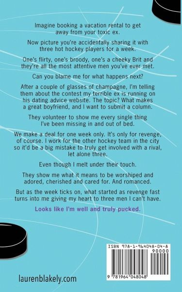 I swear I only asked one hot hockey-playing friend to give me romance lessons for the week, but three hockey stars volunteered... The post breakup plan was simple - escape from my toxic ex to a vacation rental and stay far away from men. But thanks to a booking snafu I'm accidentally sharing it with three hot hockey players. One's flirty, one's broody, one's a cheeky Brit, and they're all the most attentive men I've ever met. After a couple of glasses of champagne, I'm telling them about the contest my ex is running on his dating advice web site. The topic? What makes a great boyfriend, and I want to submit a column. All three offer to show me every single thing I've been missing in and out of bed. We make a deal for one week only. It's only for revenge, of course. I work for the other hockey team in the city so it'd be a big mistake to truly get involved with a rival, let alone three. Even though I melt under their touch. They show me what it means to be adored, cherished and romanced. But as the week ticks on, what started as revenge fast turns into me giving my heart to three men I can't have. Looks like I'm well and truly pucked.