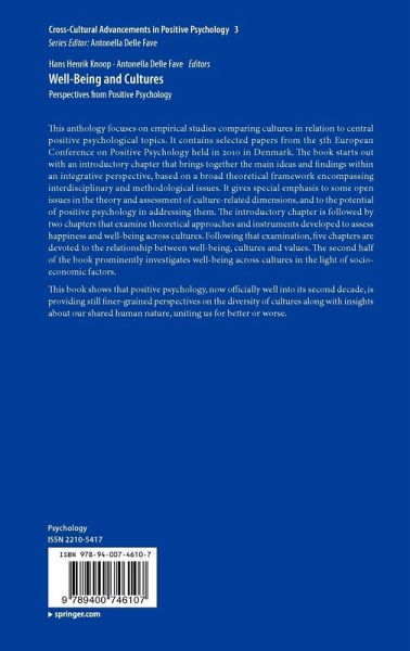 Chapter 1. Positive Psychology and cros-cultural research; Hans Henrik Knoop and Antonella Delle Fave.- Chapter 2. VIA Character Strenghts -Research and Practice: The First 10 Years; Ryan M. Niemiec.- Chapter 3. Addressing current challenges in cross-cultural measurement of well-being: The Pemberton Happiness Index; Carmelo Vazquez and Gonzalo Hervas.- Chapter 4. Comnunal values and individualism in our era of globalization: A comparative longitudinal study of different societies; Holde Eileen Nafstad and Erland Sand Bruer.- Chapter 5. The Relation of Basic Psychological Needs, Intrinsic and Extrinsicc Life Goals and Collectivism with Subjective Well-Being; A Case in Macedonia.- Chapter 6. The Ubiquity of the Character Strenghts in African Traditional Religion: A Thematic Analysis.- Chapter 7. Culture, Environmental Psychology and Well-Being: An Emergent Theoretical Framework; Nicola Rainisio.- Chapter 8. Religion, Spirituality and Well-Being across Nations: The Eudaimonic and Hedonic Happiness Investigation; Antonella Delle Fave, Ingrid Brdar, Dianne Vella-Brodrick and Marie P. Wissing.- Chapter 9. The Relationship of South African consumers' living standards and demographic variables with their life satisfaction.- Chapter 10. Circumstances of Well-Being among Czech College Students; Iva Solcava and Vladimir Kebza.- Chapter 11. Income is Not Associated with positive Affect, Life Satisfaction, and Subjective Happiness among Japanese Workers; Yasumasa Otsuka, Masashi Hori, and Junko Kawahito.- Chapter 12. Relationships between self Serving Attributional Bias and Subjective Well-being among Danish and Spanish Women; Pilar Sanjuana and Kristine Jensen de Lopez.- Chapter 13. Optimistic Attributional Style and Parental Behaviour in the Educational Framework: A Cross-Cultural Perpective; Loredana Ruxandra Gherasim, Simona Butnaru, Alin Gavreliuc and Luminita Mihaela Iacob.-