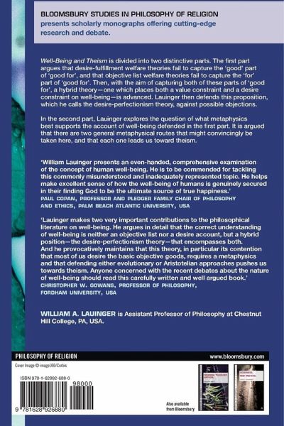 Well-Being and Theism is divided into two distinctive parts. The first part argues that desire-fulfillment welfare theories fail to capture the 'good' part of 'good for', and that objective list welfare theories fail to capture the 'for' part of 'good for'. Then, with the aim of capturing both of these parts of 'good for', a hybrid theory-one which places both a value constraint and a desire constraint on well-being-is advanced. Lauinger then defends this proposition, which he calls the desire-perfectionism theory, against possible objections. In the second part, Lauinger explores the question of what metaphysics best supports the account of well-being defended in the first part. It is argued that there are two general metaphysical routes that might convincingly be taken here, and that each one leads us toward theism.
