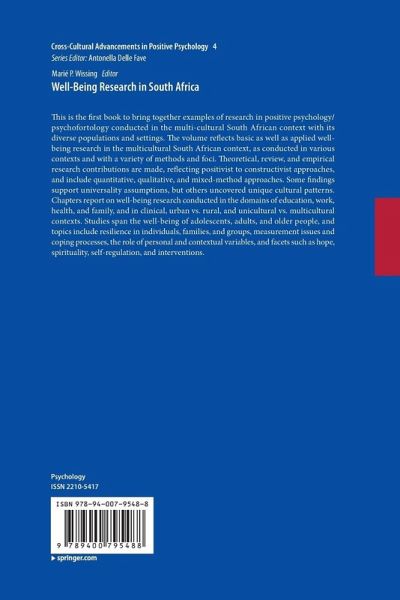 This is the first book to bring together examples of research in positive psychology / psychofortology conducted in the multi-cultural South African context with its diverse populations and settings. The volume reflects basic as well as applied well-being research in the multicultural South African context, as conducted in various contexts and with a variety of methods and foci. Theoretical, review, and empirical research contributions are made, reflecting positivist to constructivist approaches, and include quantitative, qualitative, and mixed-method approaches. Some findings support universality assumptions, but others uncovered unique cultural patterns. Chapters report on well-being research conducted in the domains of education, work, health, and family, and in clinical, urban vs. rural, and unicultural vs. multicultural contexts. Studies span the well-being of adolescents, adults, and older people, and topics include resilience in individuals, families, and groups, measurement issues and coping processes, the role of personal and contextual variables, and facets such as hope, spirituality, self-regulation, and interventions.