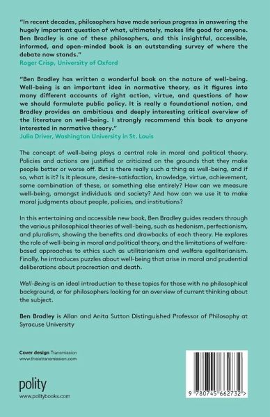In this entertaining and accessible new book, Ben Bradley guides readers through the various philosophical theories of well-being, such as hedonism, perfectionism and pluralism, showing the benefits and drawbacks of each theory. He explores the role of well-being in moral and political theory, and the limitations of welfare-based approaches to ethics such as utilitarianism and welfare egalitarianism. Finally, he introduces puzzles about well-being that arise in moral and prudential deliberations about procreation and death.