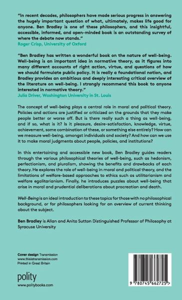 In this entertaining and accessible new book, Ben Bradley guides readers through the various philosophical theories of well-being, such as hedonism, perfectionism and pluralism, showing the benefits and drawbacks of each theory. He explores the role of well-being in moral and political theory, and the limitations of welfare-based approaches to ethics such as utilitarianism and welfare egalitarianism. Finally, he introduces puzzles about well-being that arise in moral and prudential deliberations about procreation and death.