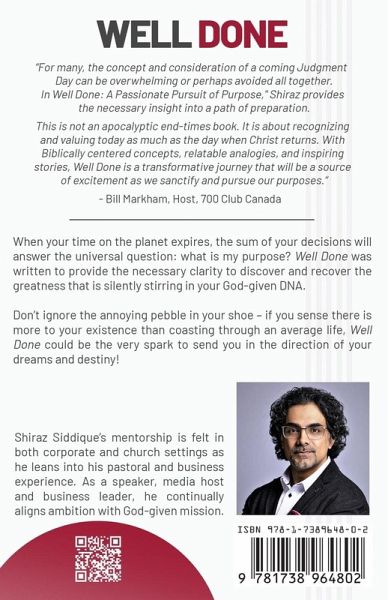 When your time on the planet expires, the sum of your decisions will answer the universal question: what is my purpose? Don't ignore the pebble in your shoe - Well Done provides the necessary clarity to discover and recover the greatness that is silently stirring in your God-given DNA. If you sense there is more to your existence than coasting through an average life, Well Done could be the very spark to send you in the direction of your dreams and destiny! For many, the concept and consideration of a coming Judgment Day can be overwhelming or perhaps avoided all together. In "Well Done: A Passionate Pursuit of Purpose," Shiraz provides the necessary insight into a path of preparation. This is not an apocalyptic end-times book. It is about recognizing and valuing today as much as the day when Christ returns. With Biblically centered concepts, relatable analogies, and inspiring stories, Well Done is a transformative journey that will be a source of excitement as we sanctify and pursue our purposes. - Bill Markham, Host, 700 Club Canada
